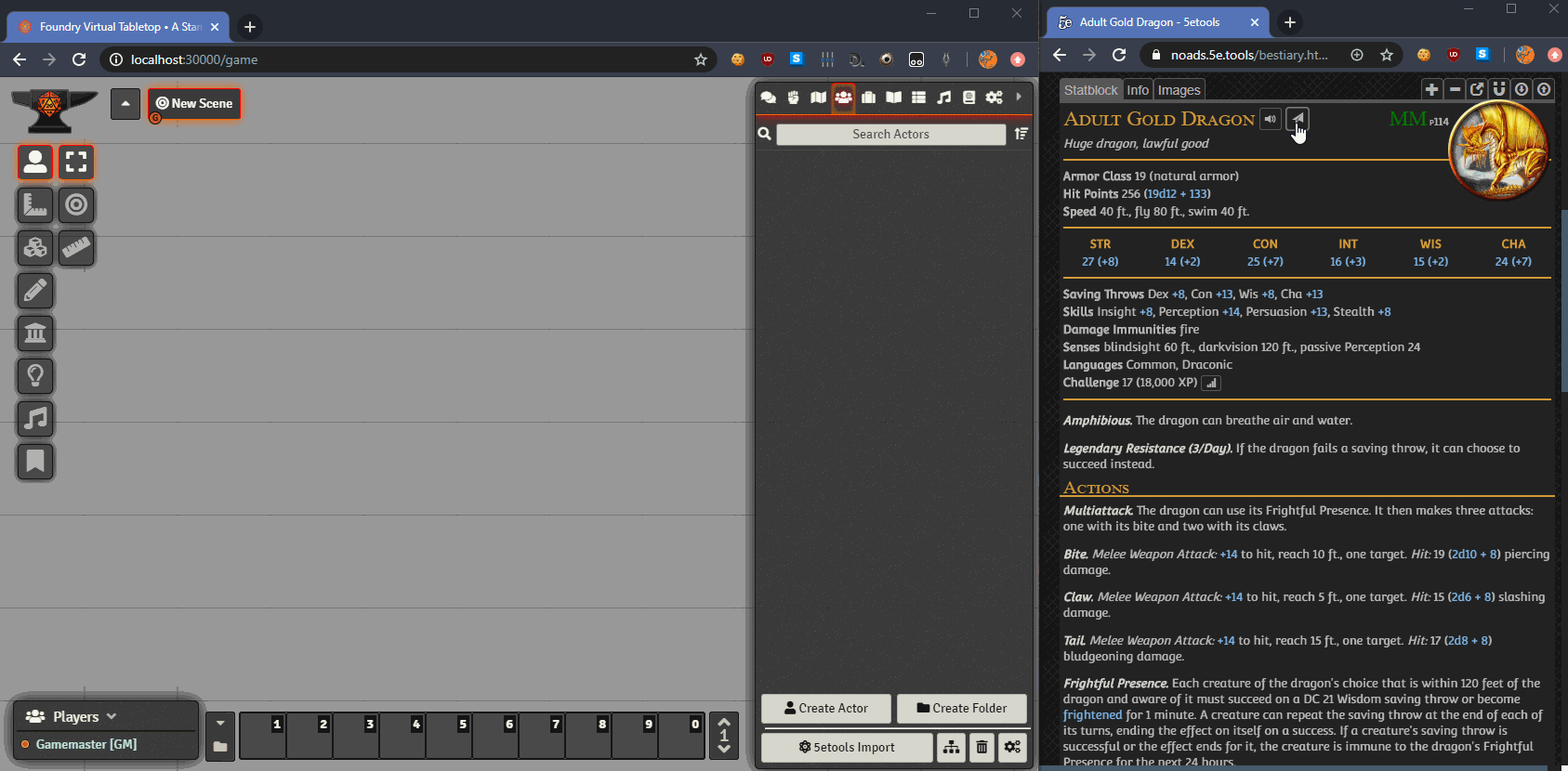 With Rivet installed, and provided you have 5etools and Foundry open in the same browser, you can send content and rolls from 5etools straight to your Foundry game with the click of a button.